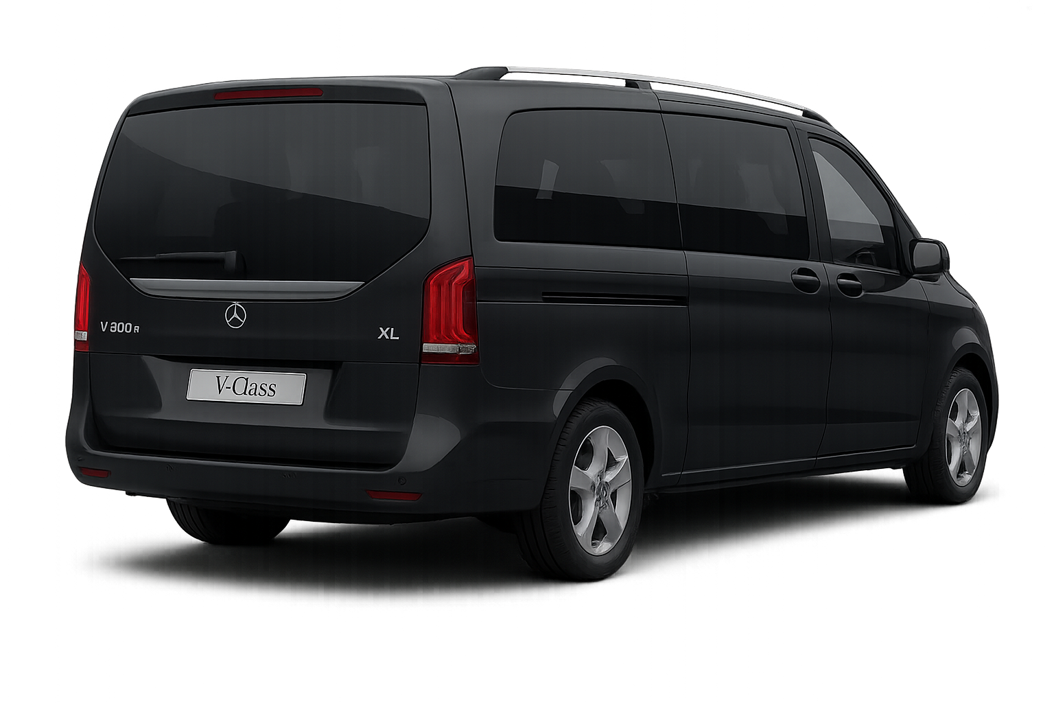 VANDie Mercedes-Benz V-Klasse XL als 7-Sitzer verbindet elegantes Design mit maximalem Raumkomfort. Aus jeder Perspektive wirkt sie hochwertig und modern: Die Front überzeugt mit markantem Kühlergrill und LED-Leuchten, die Seitenansicht betont die verlängerte XL-Karosserie mit großzügigen Fensterflächen, und das Heck zeigt klare Linien, praktische Details und viel Stauraum – ideal für Familien oder Businessreisen.
